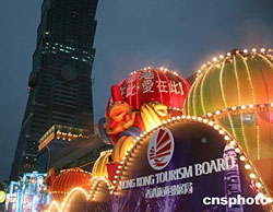 香港、澳門特區今年再度參加臺北元宵燈節。燈節將于本月十九日開幕,預計將有六百萬左右的臺灣民眾到場參觀。香港“金雞報喜詠香江”花車和澳門特區旅游局贊助的“夢想前進”燈座花車在臺北一〇一大廈旁亮相。作者:曾嘉