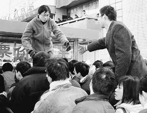 10時左右,人越來越多,市場前的紅旗路上人擠著人,綿延1公里,抬腳都困難,人群中不斷傳出被踩到腳的尖叫聲,10分鐘時間里,記者愣是沒走出200米。汽車、自行車和小商販的三輪車夾在人群中間動彈不得,209路公交車無奈只好改線,一位乘客嘟囔著:“早就該實行交通管制。”雖然主辦方明確規(guī)定不得在場外招聘,可路邊的“招聘”牌子還是一個挨著一個,散發(fā)的各種小廣告隨地可見,5元一張的門票被炒到10元。