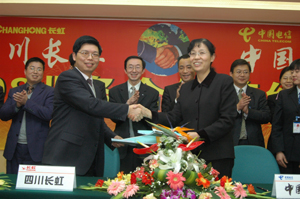 中新網3月7日電 3月4日,“中國電信-四川長虹4008業務合作簽約儀式”在四川省綿陽市隆重舉行。長虹電器股份有限公司副總經理鄔江與中國電信集團公司大客戶事業部梁志平總監代表雙方在協議書上簽字。