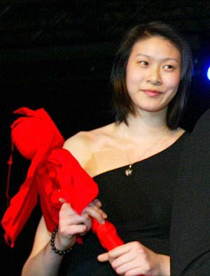 一襲黑色長裙,露出半邊肩膀,是好萊塢剛流行過的式樣。趙蕊蕊顯然是無法習慣這樣性感的裝束,羞答答地上了臺。直到迎上帥哥索普贊許的眼神,更是露出一臉羞澀的笑容。“還真不習慣這樣穿,別扭極了。”說話聲音一如平時的爽朗,“還是運動衣更符合我的氣質。”這樣的曳地長裙,還會再穿么?“也許不會了吧。”