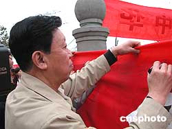 2005年是中國第一個資產階級政黨中國同盟會成立100周年。在同盟會中與孫中山先生并肩作戰的黃興先生,是中國近代史上著名的資產階級革命家。4月5日,黃興的孫子黃偉民來到位于長沙岳麓山上的黃興墓碑前簽名紀念。作者:肖前輝