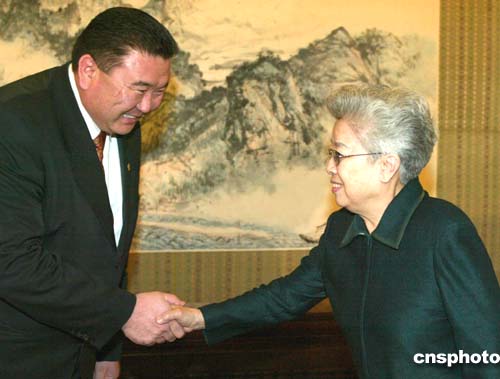 中國國務院副總理吳儀四月七日在北京會見蒙古交通運輸旅游部長、中蒙經貿聯委會蒙方主席巴特呼。作者:滿會喬