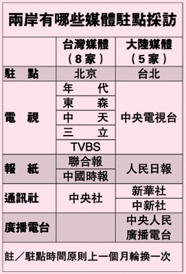 兩岸開(kāi)放媒體記者采訪,大陸方面先于臺(tái)灣。1996年12月,國(guó)臺(tái)辦公布“關(guān)于臺(tái)灣記者來(lái)祖國(guó)大陸采訪的規(guī)定”,正式開(kāi)放臺(tái)灣媒體到大陸采訪,目前有8家臺(tái)灣媒體派記者原則以1個(gè)月一輪方式,定期到北京采訪。