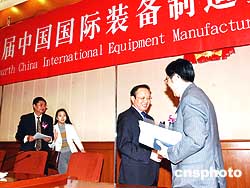 四月十二日,第四屆中國國際裝備制造業博覽會在北京人民大會堂舉行新聞發布會,中國商務部副部長魏建國(右二)、遼寧省副省長李萬才(右一)分別介紹中國機電產品進出口和展覽會籌備情況。第四屆中國國際裝備制造業博覽會將于八月三十日在沈陽舉行。作者:王麗南