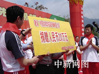 中國女排主教練陳忠和和隊長馮坤把寫著20萬元人民幣的支票捐獻給先鋒小學師生
