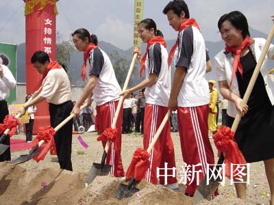 中國女排隊員為希望小學奠基培土。