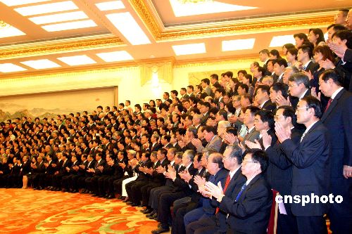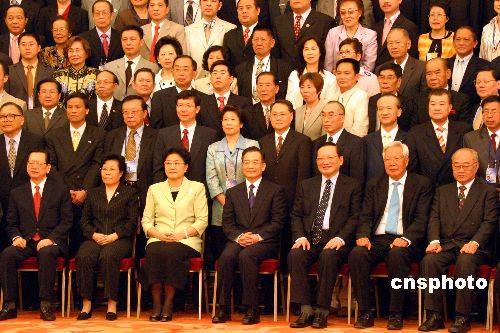 五月二十日,中國國務院總理溫家寶、國務委員唐家璇、全國政協副主席劉延東、全國政協副主席羅豪才、國務院僑辦主任陳玉杰等在北京人民大會堂會見“第三屆世界華僑華人社團聯誼大會”的全體與會代表并合影留念。作者:張勤