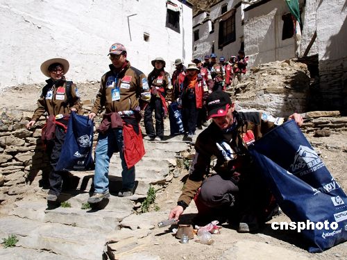 5月26日,“2005地球第三極珠峰大行動”志愿者一行,在當地藏民和游客們共同參與下,對位于西藏定日縣境內海拔4400米的協格爾曲德寺進行了清掃和環保宣傳活動。協格爾曲德寺創建于1385年,是一座依山而建的古寺。一上午的清掃工作成果頗豐,沿路的山洼里有一些多年無人問津的“死角”,滿是鐵皮手電筒,廢棄電池,鋁制飲料罐等對環境危害極大的不可降解性垃圾。作者:王驥