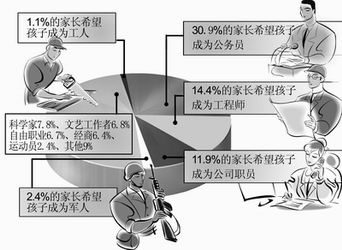 但調查同時顯示,家長對孩子未來期望過高。近三分之一的父母希望自己的孩子將來能夠成為公務員,只有1.1%的家長希望孩子成為工人(見圖1)。父母對孩子的希望一定程度上反映了當今社會的一種價值取向。