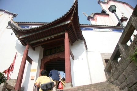 筆者一行自云陽新城的南岸驅舟,橫穿長江抵達南岸的張飛廟碼頭。船行長江,江上風清日烈。談笑間,舟已至南岸。棄舟登岸,拾階而上。路陡且窄,兩邊多仿古店肆,店家小販叫賣不斷。烈日如炙,同行者皆汗流夾背。
