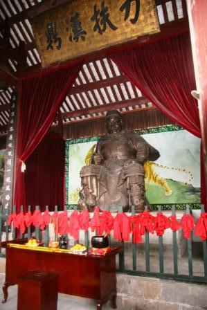 大殿銅像上面,懸掛了“力扶漢鼎”的牌匾。銅像前,游客多將紅布結系到銅像前的欄桿上,祈求平安。此間百姓將張將軍奉為神明,船夫漁民更是虔誠,張飛生日、逢年過節都要焚香供奉。傳說張飛在云陽幾次顯靈,除了那次讓張鵬翮膜拜,還有一次是明末張獻忠率大軍沿長江進軍四川,張飛一腳立江中,一腳立云陽縣城,不讓張獻忠入川。張飛在長江上便名聲大噪,成了保佑過往船只一路平安的神靈。