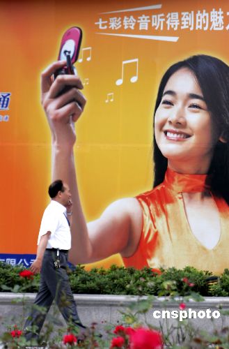 6月16日,上海一手機用戶正打手機經過中國電信小靈通彩鈴手機廣告。統計顯示:中國手機用戶彩信彩鈴使用率大幅提高。作者:吳芒子