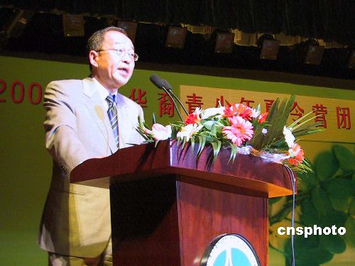 二00五印尼華裔青少年夏令營6月28日下午在湖南長沙閉營。國務院僑務辦公室副主任、中國新聞社社長劉澤彭、湖南省副省長賀同新及國僑辦相關部門負責人參加閉營式。圖為劉澤彭寄語印尼華裔青少年,希望他們將看到和學到的博大精深的中華文化帶回印尼。作者:劉雙雙