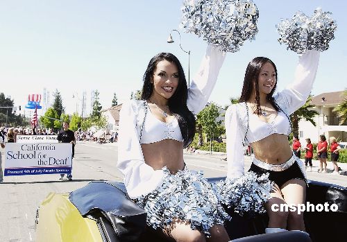 美西佛里蒙特市舉行七月四日“永遠的星條”國慶節游行,圖為游行隊列中的美女啦啦隊員。作者:陳鋼