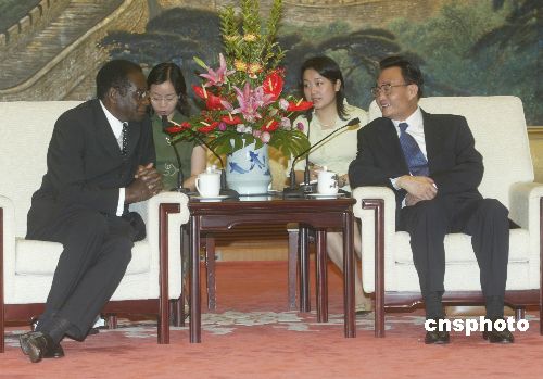 七月二十七日,中國全國人大常委會委員長吳邦國在北京人民大會堂與來訪的津巴布韋總統穆加貝會談。作者:史利