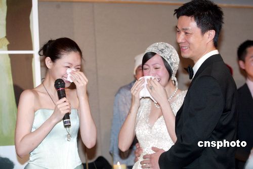 七月二十九日,臺灣著名藝人“小S”徐熙娣(中)與許雅鈞(右)在臺北舉行訂婚典禮,大S徐熙媛(左)祝賀妹妹幸福,高興得自掉眼淚。作者:盛佳鵬