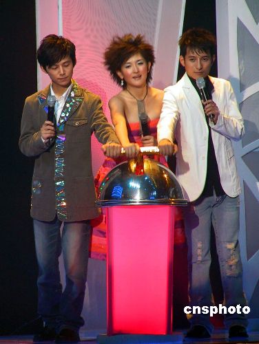 7月30日晚,陪伴中國觀眾走過8年歲月的娛樂節目《快樂大本營》進行了改版晚會,快樂主持群何炅(左)、李維嘉(右)、謝娜進行了一場告別演唱會。在接下來的一個月里,他們將通過觀眾短信票選來決定誰能繼續留任。圖為快樂主持群一起開通短信支持通道。作者:鄧霞