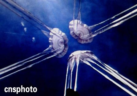 中新網洛杉磯七月三十一日電(記者 賈國榮)美國宇航局(NASA)今天向媒體提供的圖像顯示,發現號助推火箭完成任務降落時,在藍天中綻開三頂雪白的降落傘,美觀如當今世界“天女散花”。