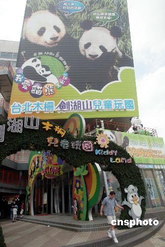 八月九日,臺北木柵劍湖山兒童玩國正在進行“我愛貓熊寓教展”,其游樂設施從各個方面介紹大熊貓,供參觀者參觀。圖為臺北木柵劍湖山兒童玩國在門口樹立的大幅熊貓宣傳海報。作者:盛佳鵬