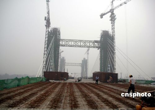 受石家莊市市民關注的槐安路大橋近日將實現東西兩側的邊跨合龍,8月11日,正在按計劃推進“大合龍”的前期準備。石家莊市槐安路大橋是該市道路交通設施改造的重點工程,是該市第一座高架斜拉橋。作者:林風風