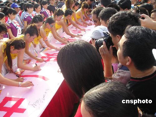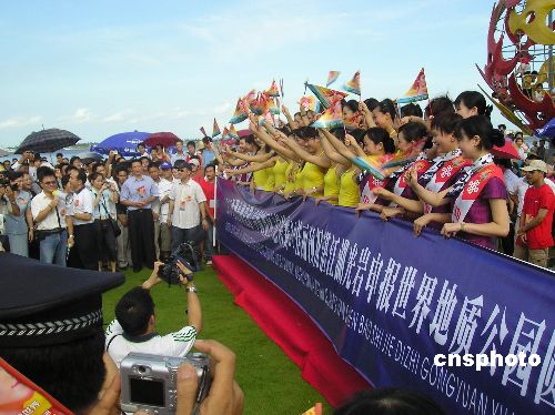 8月14日,2005年亞洲小姐(中國(guó)賽區(qū))進(jìn)入總決賽的20名候選佳麗來(lái)到廣東湛江,傾情支持該市湖光巖申報(bào)世界地質(zhì)公園。作者:馬燦