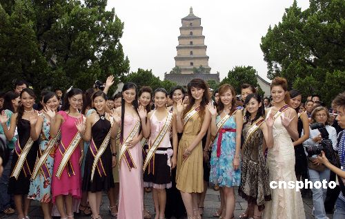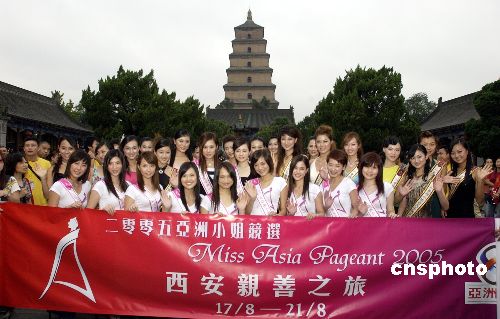 8月17日,參加西安“2005亞洲小姐總決賽”的20位內地妙齡佳麗以及來自香港的12位選手和上屆冠軍呂晶晶、馮梓瑩一行抵達古城西安,并游覽了久負盛名的大慈恩寺,吸引了眾多中外游客。作者:侯智