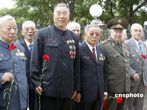 八月十八日,被邀請參加“和平使命—2005”中俄聯(lián)合軍事演習開幕儀式的中國抗日老戰(zhàn)士和前蘇聯(lián)戰(zhàn)爭功勛軍人,來到“太平洋艦隊戰(zhàn)斗榮譽”紀念碑敬獻花圈,向在衛(wèi)國戰(zhàn)爭中英勇犧牲的俄羅斯軍人致以崇高的敬意。作者:王麗南