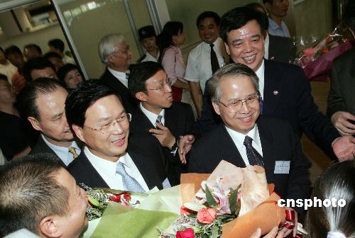 中國國民黨中央組織發展委員會主任委員廖鳳德(前左二)、臺中市黨部主任委員沐桂新(前左三)率領的臺中市黨部訪問團八月二十三日下午抵達廈門,與中共廈門市委開展互訪交流,在機場受到中共廈門市委副書記陳修茂等熱烈歡迎。這是兩黨政黨基層交流的“首航之旅”。作者:毛建軍