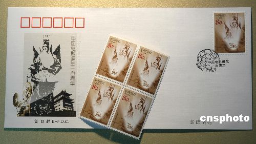 北京市郵票公司為配合國家郵政局于八月二十八日發行《中國電影誕辰一百周年》紀念郵票(一套一枚),特設計、印制了該郵票的首日封等郵品,并將于八月二十八日與郵票同時發行。郵票名稱為:中國電影誕辰一百周年,面值八十分。作者:鄒憲