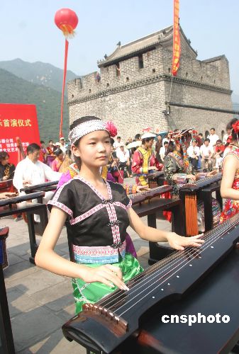 八月二十六日,居庸關(guān)長城琴聲悠揚,身著56個民族盛裝的古琴演奏者,在天下第一雄關(guān)用鐫刻著56個民族歷史文化和風(fēng)情習(xí)俗的56把極品古琴演奏了《梅花三弄》、《流水》、《關(guān)山月》《歌唱祖國》等千古名曲和時代新歌,慶祝中華人民共和國建國56周年。張勤
