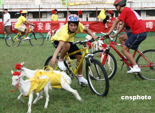 8月26日,“全國首屆自行車叼羊大賽”在山東省棗莊市舉行。比賽規定每次上場的2支參賽隊各派出4名自行車隊員,參賽隊員只有把代表自己隊伍顏色的5只小山羊叼回“羊圈”后,才有權去叼那只“公共羊”,最先叼回“公共羊”的代表隊獲勝。這次共有10支自行車代表隊參加了角逐比賽。作者:吉喆
