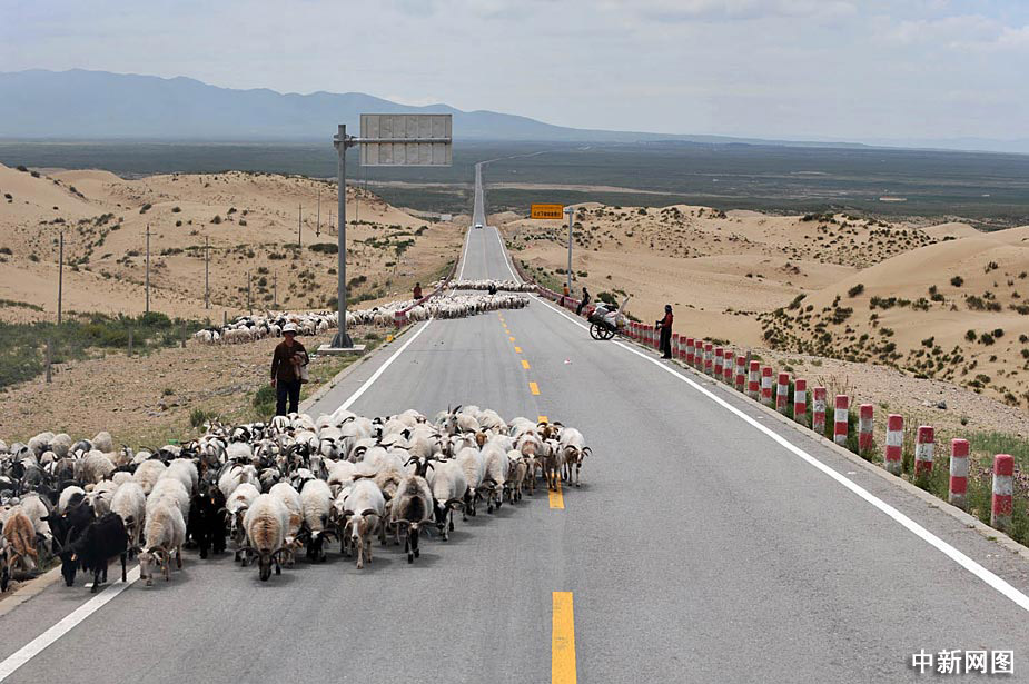 圖為公路上“過馬路”的羊群及牦牛。