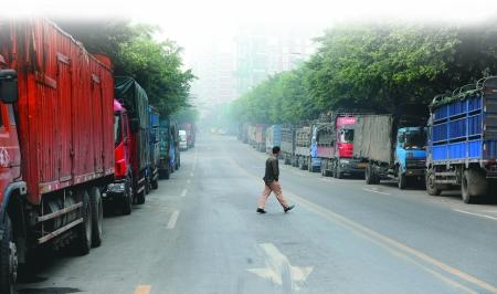 昨日,南岸白鶴路,貨運(yùn)市場(chǎng)外的道路兩旁停滿了受柴油拖累無法上路行駛的大貨車。本組圖片由首席記者 鐘志兵 攝財(cái)經(jīng)調(diào)查