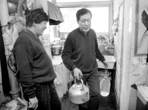 記者看到,居民常先生左手拎著塑料桶、右手提著鐵皮壺,緩慢地沿外樓梯上樓。“頂樓都沒水三個月了,我們過了個干巴巴的年。”他說,“自來水公司承諾年前來水,可沒兌現,到現在還是這樣。”
