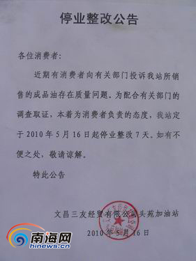 史老板說,5月18日下午他接到相關部門出具的檢測結果,對此結果他沒有異議.在19日中午文昌工商局對他的加油站進行整改,目前處于停業整改期。