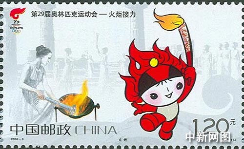 這套面值分別為1.2元、3元和6.3元,名為“點燃”和“傳遞”的紀念郵票,由著名郵票設計家王虎鳴設計,“點燃”主圖以希臘古奧林匹亞遺址雅典女祭司點燃火炬為背景,手持奧運火炬的福娃“歡歡”奮力向前奔跑為前景,表達了“點燃”的主題。而“傳遞”主圖的背景為世界最高峰珠穆朗瑪峰,前景為呈“祥云”狀熊熊燃燒、映紅了天幕的火炬。