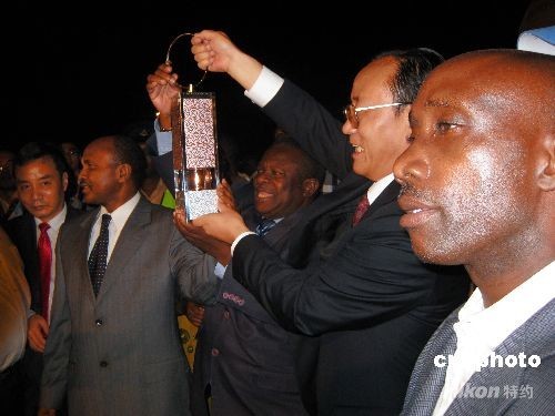 中新社達累斯薩拉姆四月十二日電(記者 沈晨)當地時間十二日晚九時三十二分(北京時間十三日凌晨二時三十二分),載有北京奧運圣火的“奧運圣火號”飛抵坦桑尼亞海濱城市達累斯薩拉姆。