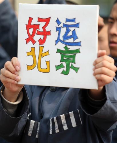 一名服刑人員舉著寫有“好運北京”的牌子。