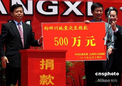 5月14日,奧運圣火瑞金傳遞結束慶典儀式后,中共江西委副書記王憲魁(左)代表江西省委省政府向四川災區人民捐款500萬人民幣。 中新社發 廖攀 攝