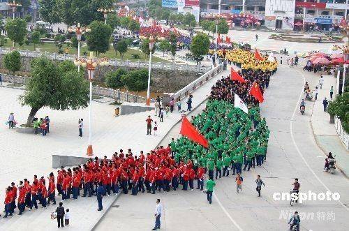 5月16日,地處偏僻山區的江西德興銅礦2008名礦山職工參加“全民健身與奧運同行”活動,以健步行、編五環等形式,傳遞奧運精神,支持北京奧運會,表達礦工喜迎奧運的心情。 中新社發 胡敦煌 攝