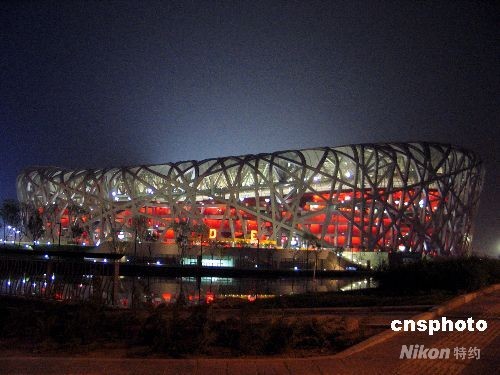 2008年5月22日,“好運北京2008搜狐中國田徑公開賽”在國家體育場開賽,首日比賽持續到當晚23:30結束。夜幕下的“鳥巢”和“水立方”在璀璨的燈光中更加壯麗紛呈,美輪美奐。 中新社發 張侃 攝