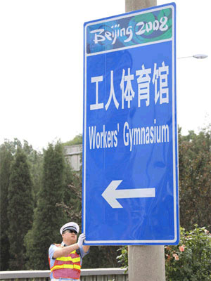 奧運(yùn)專用指路標(biāo)識的施工劃分為三個(gè)階段:6月10日至6月17日完成環(huán)路輔路等次要道路的奧運(yùn)專用指路標(biāo)志施工;6月18日至6月25日完成環(huán)路主路等主要道路的奧運(yùn)專用指路標(biāo)志施工;6月25日至6月30日完成全部奧運(yùn)專用指路標(biāo)志施工。