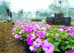 記者上午在鳥巢前看到,滿載著奧運花卉的卡車已經陸續進場,工人們將一袋袋的營養土鋪撒在空地上,一盆盆粉紅色的矮牽牛擁簇在一起,很快就形成了幾個美麗的S形。