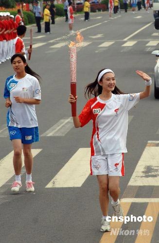 7月10日,奧運火炬在內蒙古赤峰進行傳遞,漂亮的女大學生張萌作為赤峰火炬手傳遞奧運火炬。中新社發 廖攀 攝