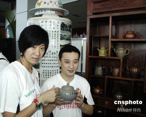 圖:奧運(yùn)冠軍展示奧運(yùn)文化作品“中華紫砂壺”