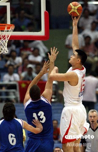 備戰北京奧運會的中國男籃,7月17日晚在杭州舉行的2008斯坦科維奇洲際杯籃球賽的首場比賽中以96比72戰勝幾乎全部為年輕選手組成的塞爾維亞隊。中國隊的“擎天柱”姚明受重傷143天后首次登場,砍下11分。中新社發 任晨鳴 攝
