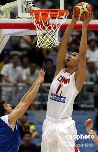 2008斯坦科維奇洲際杯籃球賽的首場比賽中,中國男籃以96比72戰勝幾乎全部為年輕選手組成的塞爾維亞隊,中國隊主力大前鋒易建聯砍下14分。中新社發 任晨鳴 攝