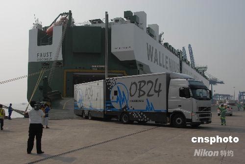 7月24日,瑞典籍大型滾裝船舶“弗斯特”號(hào)裝載的58輛高清電視轉(zhuǎn)播車(chē)在天津港滾裝碼頭接卸上岸。這批世界上最為先進(jìn)的電視轉(zhuǎn)播車(chē)來(lái)自英國(guó)、法國(guó)、比利時(shí)等6個(gè)國(guó)家,它們將全部被用于北京奧運(yùn)會(huì)的電視轉(zhuǎn)播。 中新社發(fā) 胡志強(qiáng) 攝