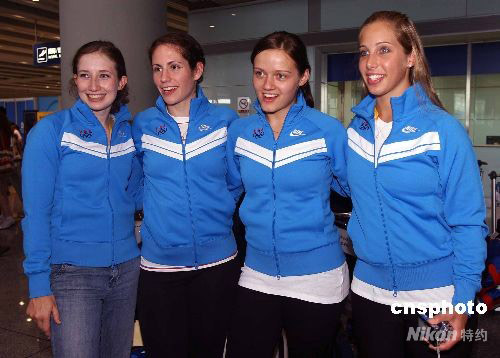 7月31日,剛剛抵達北京的美國代表隊4名女運動員,身著隊服興奮地在北京首都國際機場合影。 中新社發 劉新 攝