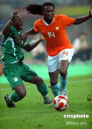 8月7日晚,在天津“水滴”體育場奧運男足小組賽上,荷蘭隊員14號埃萬德-斯諾場上嚴重犯規被紅牌罰下場。圖為荷蘭14號隊員場上突破。中新社發 陳文 攝